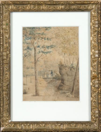 encadré, déchirures restaurées en haut du papier sur 5.5 cm, 1 cm b. g et griffure au niveau du rocher