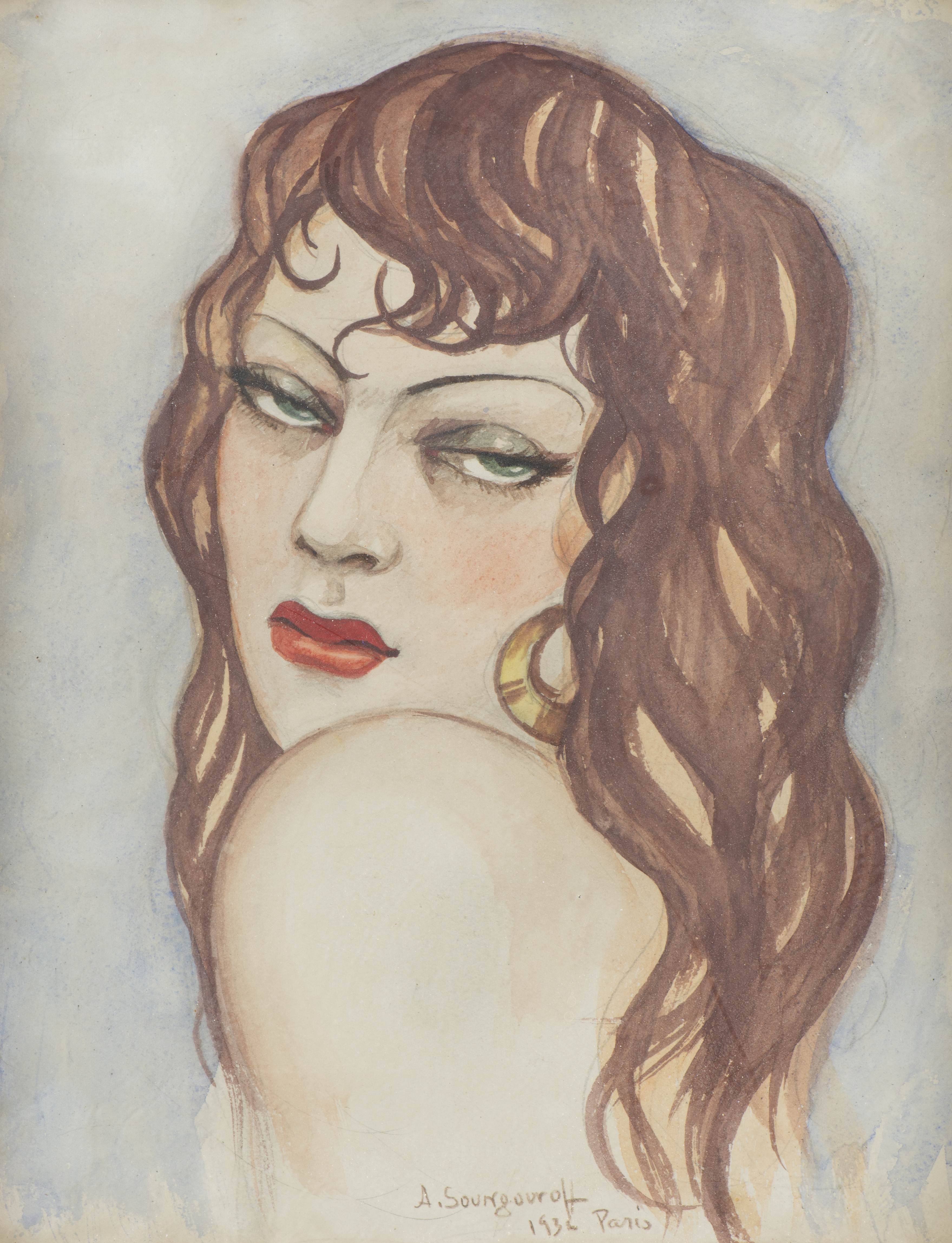 Anatola SOUNGOUROFF (1911-1982), Portrait de jeune femme, Aquarelle sur papier, signé en bas au milieu localisé à Paris daté 1932.