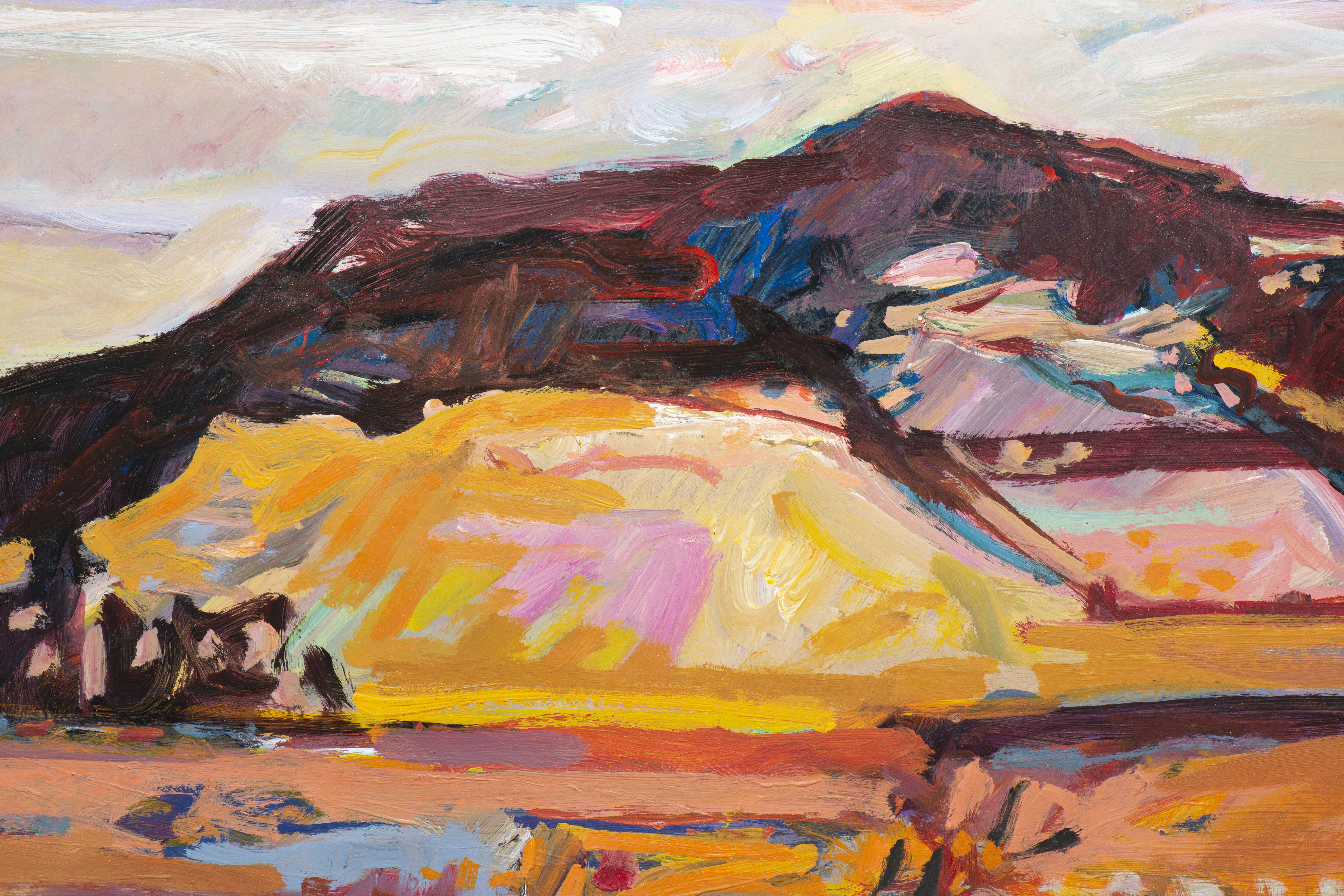 Jean KRILLÉ (1923-1991), "Paysage avec montagne dans un ciel rose", acrylique sur isorel, signé en bas à gauche.